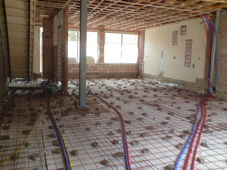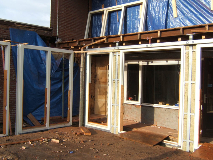 Overzicht van werkzaamheden tijdens de uitvoeringsfase van de verbouwing. Naast uitbouwen van voor- en achterzijde is ook de begane grondvloer volledig vervangen. Een nieuwe betonvloer is voorzien van vloerverwarming. De trap heeft een betere plek gekregen en de nieuwe kozijnen zijn van hout (DRM).